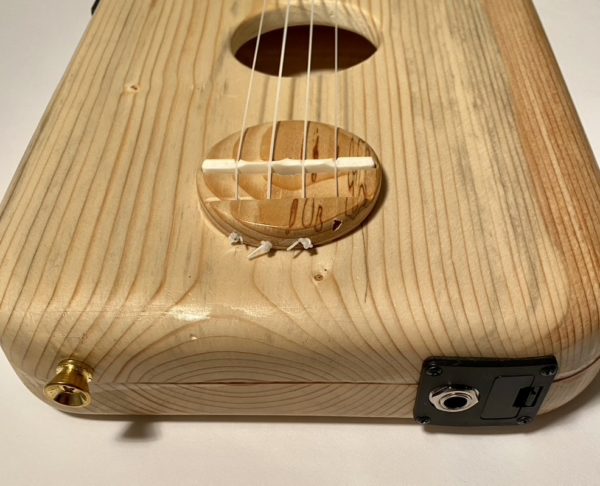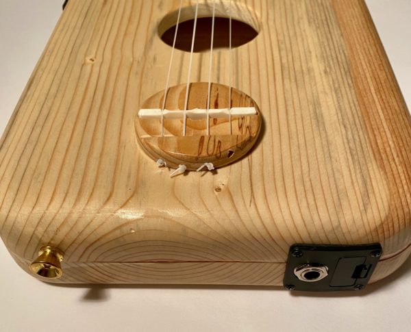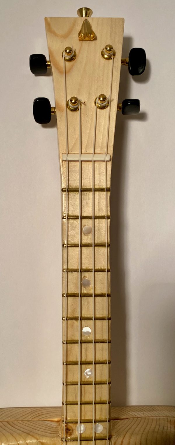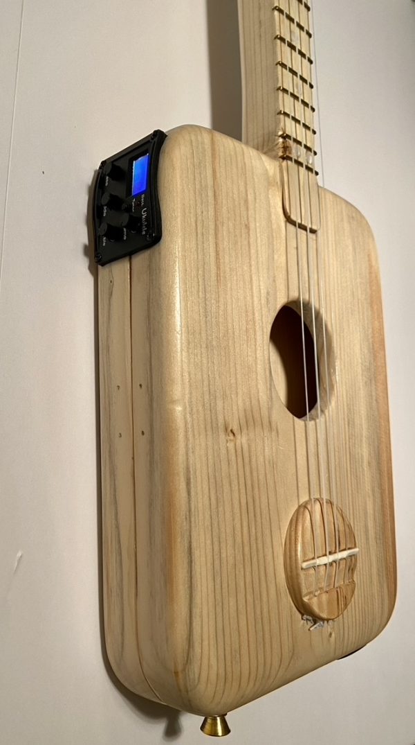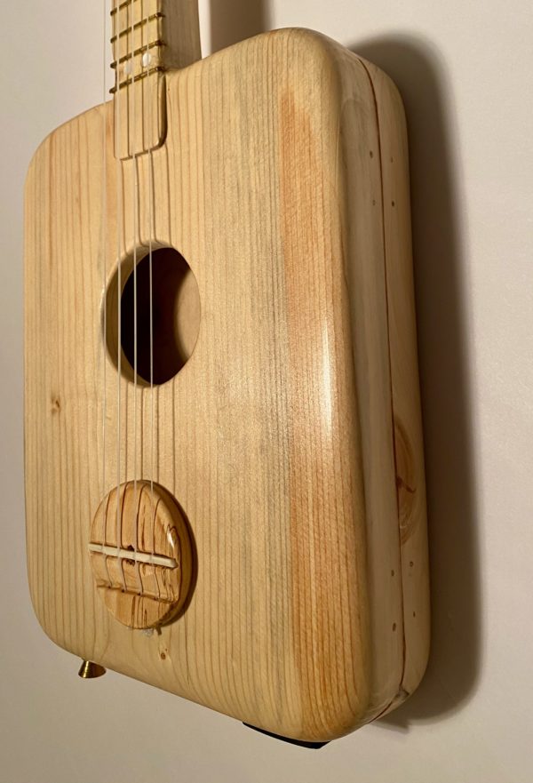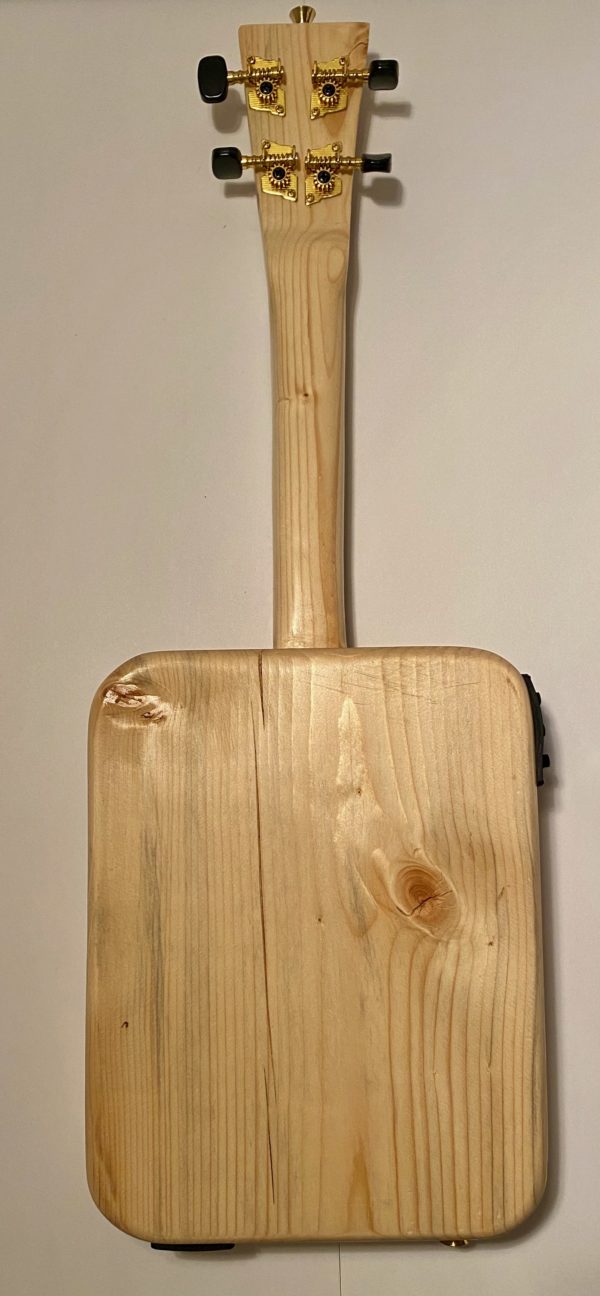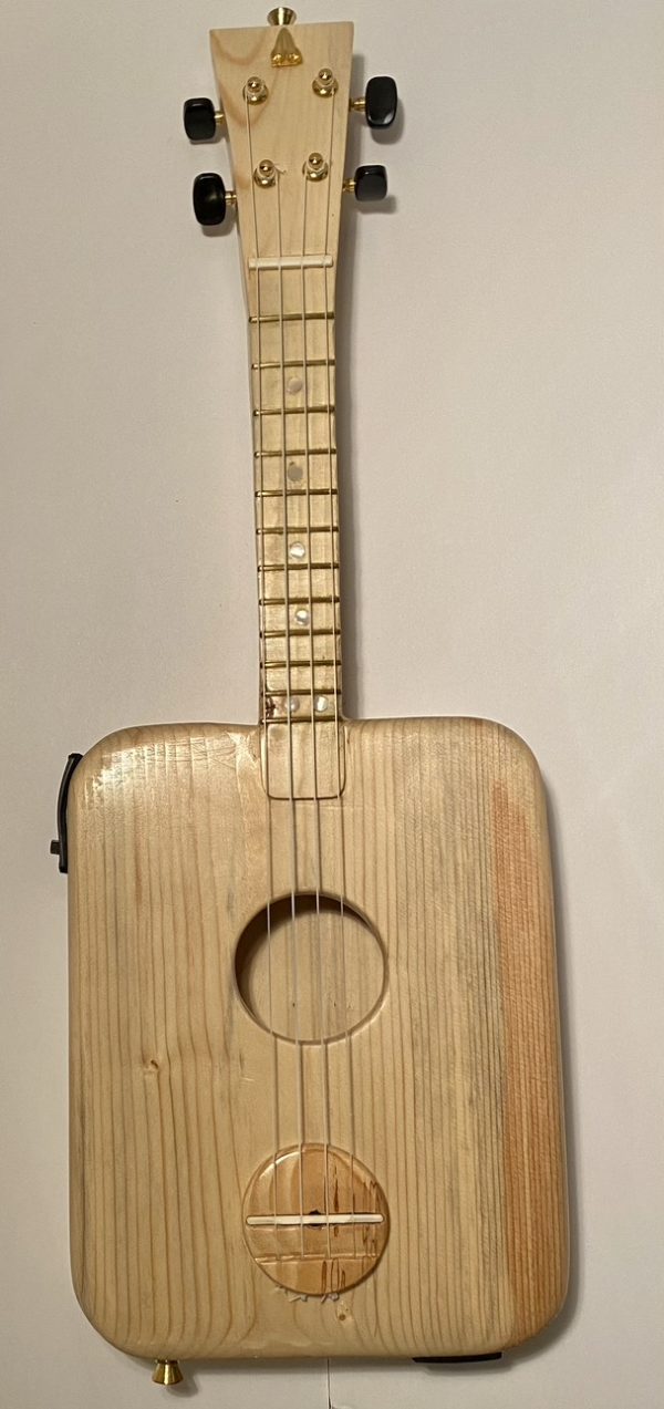 The Pine Box Acoustic/Electric Ukulele is made from a single piece of Ponderosa Pine harvested from Clear Creek, Colorado in 2019. It features gold plated hardware, built in tuner, and a tiny gold Dream Chaser spacecraft on the head stock.
